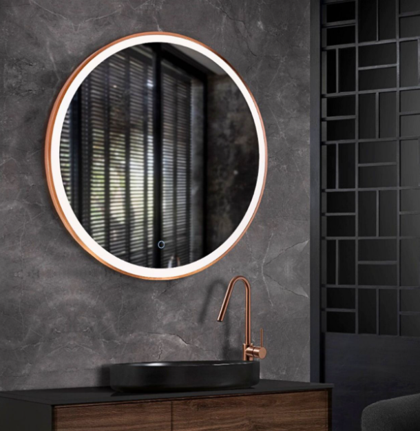 Espejo redondo con marco de aluminio negro mate, oro cepillado y oro rosa cepillado que combina simplicidad y diseño, aportando color y estilo a tu cuarto de baño.