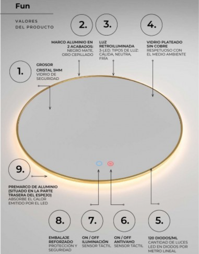 - Todos nuestros espejos son de alta calidad, utilizando las últimas tecnologías tanto en las lunas de los espejos como en los leds o drivers. Incluye tecnología de retroiluminación para ofrecer una mayor practicidad y comodidad al usarlo. La fuente de alimentación es de normativa IP44, lo que la hace resistente al agua. Cuenta con varias certificaciones como TUV, SGS y ROHS, que garantizan la calidad del producto.