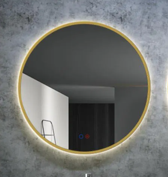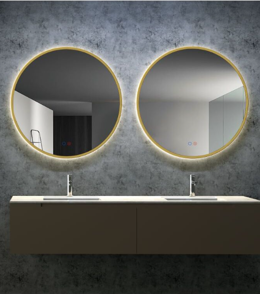 Espejo que combina lo simple de un espejo redondo retro-iluminado con el valor añadido del marco en aluminio color oro cepillado que aporta calor y diseño al cuarto de baño